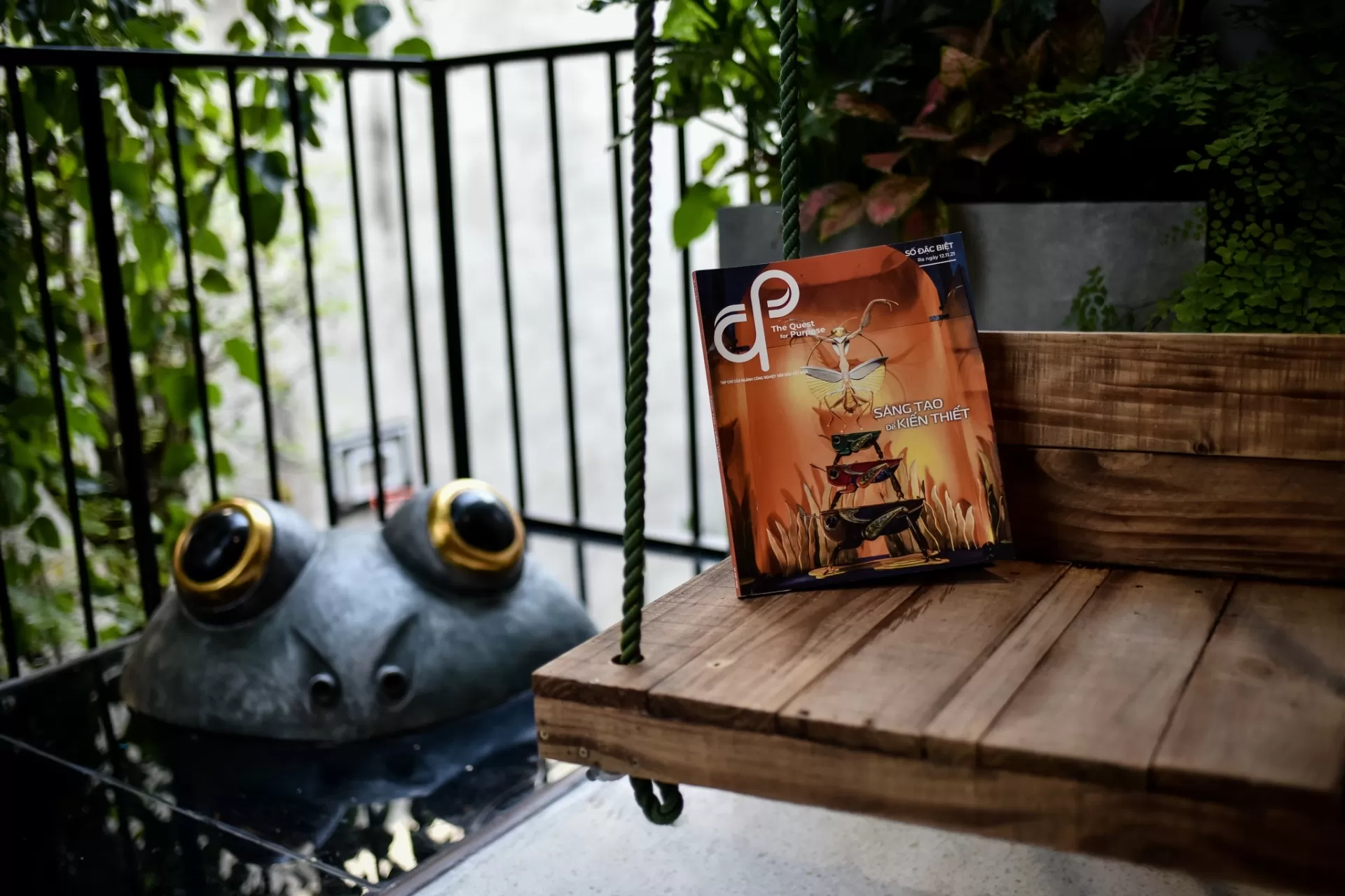 Ra đến ban công Tầng 2, bên tay trái là một khu vườn nhỏ với những khóm cây được trồng và chăm sóc với rất nhiều tình yêu thương, có lẽ vì vậy mà chúng như thổi xanh một phần không gian Xưởng. Để tạo thêm phần thơ mộng và lãng mạn cho không gian, bên tay phải ban công là một chiếc xích đu gỗ. Lúc trời gần chợp tối bạn có thể ngồi đung đưa nhẹ nhàng, ngắm trời ngắm đất, ngắm cây bồ đề với những chiếc đèn nhỏ đang nhấp nháy lấp lánh.