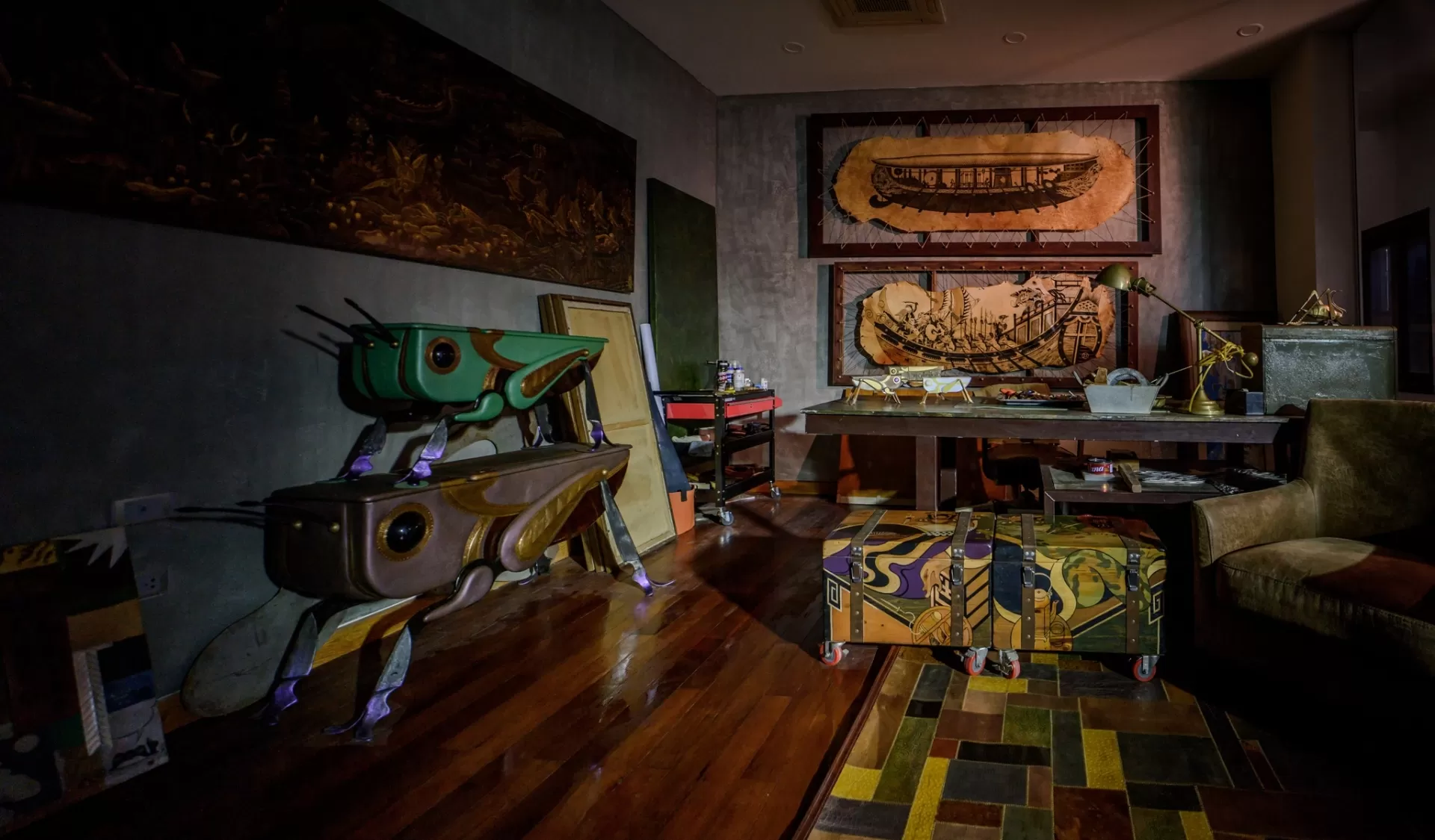 Bước lên những bậc thang gỗ sẽ tới không gian Tầng 2, cũng chính là xưởng làm việc của hoạ sĩ Tạ Huy Long. Nơi đây vừa là nơi triển lãm “Thứ Bảy tới xưởng tôi chơi!” diễn ra vừa là không gian sáng tạo nhiều tác phẩm nghệ thuật khác nhau của hoạ sĩ. Xưởng làm việc của hoạ sĩ được trưng bày các tác phẩm tranh sơn mài, tranh màu nước, các phiên bản pop-up của các sắp đặt, và cả những tác phẩm điêu khắc nhiều chất liệu theo trật tự ngẫu hứng nhưng cũng rất chân thực trong quá trình sáng tạo tác phẩm. Dường như cả thế giới đồng dao và huyền thoại được hoà vào làm một tại nơi chốn kì diệu này. Điều đặc biệt trong các tác phẩm của hoạ sĩ Tạ Huy Long là việc biến những món đồ dùng tiện ích thường ngày như chiếc vali hay chiếc rương, kệ bàn, thổi hồn cho chúng thành các tác phẩm nghệ thuật.